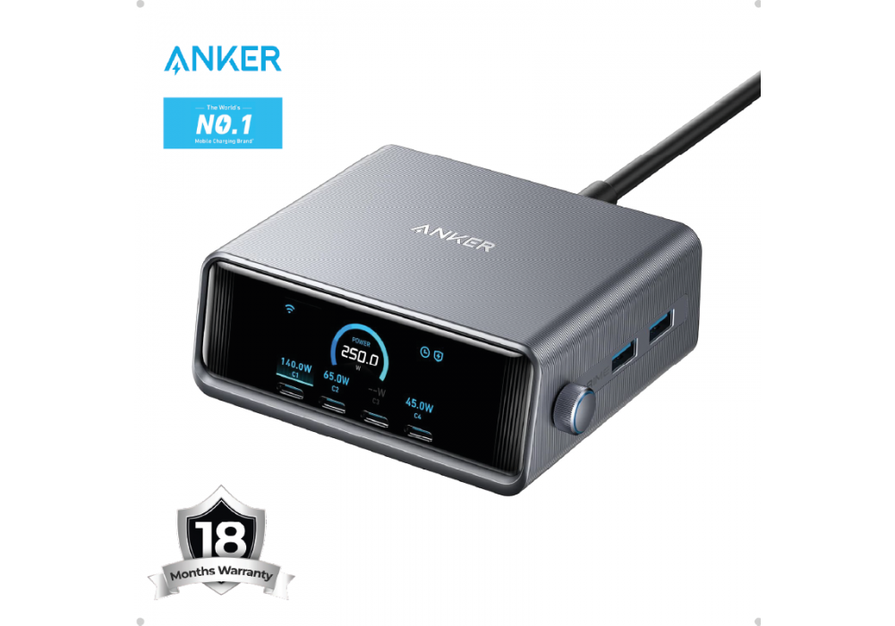 Anker Prime 250W USB C Charger, 6 Port GaN Ultra-Fast Charging Dock, 2.26″ LCD Display, Smart Control Wheel, MacBook Pro/Air, iPhone 16/15/14, Pixel, Galaxy, Apple Watch, and More / 18 Months Warranty