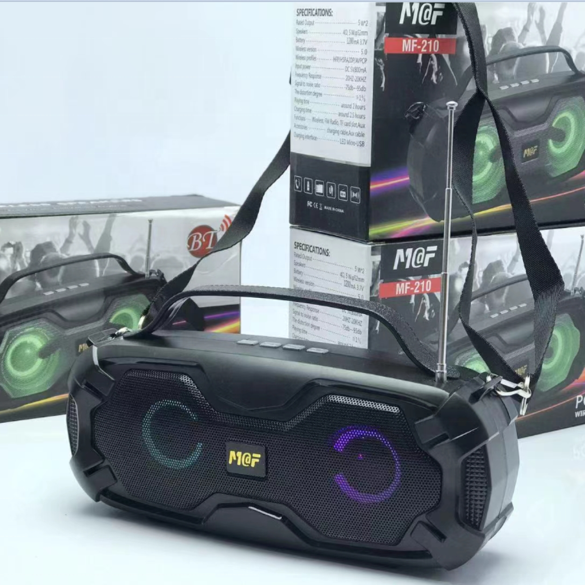 Wireless transmission range:10MAudio noise ratio:≥90dbBattery capacity:1200mAhVoltage:3.7VNormal volume playing time:5-6 hoursHorn specification; OD 52mm x2pcsThe speaker power:4 Ω / 10WFrequency response:120hz-20khzCarton capacity:100pcsCharging voltage:5V / 500MA