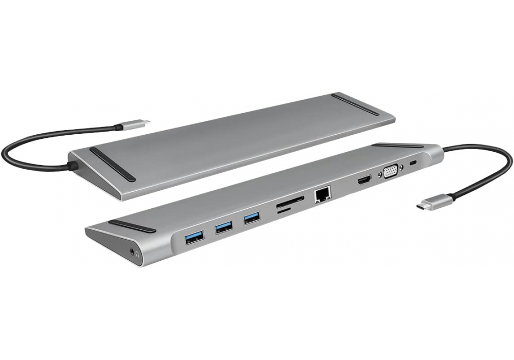 Dock Station Hub Stand USB 3.2 (Gen 1) Docking Station with 10 Ports and PD (Power Delivery) 100 W, 3 x USB / 1 x HDMI / 1 x VGA / 1 x CardReader / 1 x RJ45 / 1 x 3.5 mm/Black, Silver