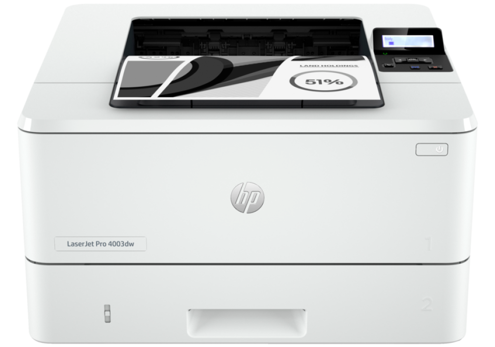 HP LaserJet Pro 4003dw Printer (2Z610A)HP LaserJet Pro 4003dw Printer (2Z610A) All tech specsFunctionsPrintPrint speed black (ISO, letter)Up to 42 ppm 1Print speed black (ISO, A4)Up to 40 ppm 1First page out black (letter, ready)As fast as 6.1 sec 2 ( Measured using ISO/IEC 17629. For more information see http://www.hp.com/go/printerclaims. Exact speed varies depending on the system configuration, software application, driver, and document complexity.)First page out black (A4, ready)As fast as 6.3 sec 2 ( Measured using ISO/IEC 17629. For more information see http://www.hp.com/go/printerclaims. Exact speed varies depending on the system configuration, software application, driver, and document complexity.)First page out color (letter, ready)2 ( Measured using ISO/IEC 17629. For more information see http://www.hp.com/go/printerclaims. Exact speed varies depending on the system configuration, software application, driver, and document complexity.)First page out color (A4, ready)2 ( Measured using ISO/IEC 17629. For more information see http://www.hp.com/go/printerclaims. Exact speed varies depending on the system configuration, software application, driver, and document complexity.)Duty cycle (monthly, letter)Up to 80,000 pagesUp to 80,000 pages (Duty cycle is defined as the maximum number of pages per month of imaged output. This value provides a comparison of product robustness in relation to other HP LaserJet or HP Color LaserJet devices, and enables appropriate deployment of printers and MFPs to satisfy the demands of connected individuals or groups.)Duty cycle (monthly, A4)Up to 80,000 pages (Duty cycle is defined as the maximum number of pages per month of imaged output. This value provides a comparison of product robustness in relation to other HP LaserJet or HP Color LaserJet devices, and enables appropriate deployment of printers and MFPs to satisfy the demands of connected individuals or groups.)Recommended monthly page volume750 to 4,000 (HP recommends that the number of printed pages per month be within the stated range for optimum device performance, based on factors including supplies replacement intervals and device life over an extended warranty period.)Print quality black (best)Fine Lines (1200 x 1200 dpi)Print languagesHP PCL 6, HP PCL 5e, HP postscript level 3 emulation, PDF, URF, PWG RasterPrint technologyLaserNetwork capabilitiesYes, via built-in 10/100/1000Base-TX Ethernet, Gigabit; Auto-crossover Ethernet; Authentication via 802.1X ( does not apply to D bundles)Minimum System Requirements for Macintosh2 GB available hard drive space; Internet connection or USB port Internet browser. For additional OS hardware requirements see apple.comMinimum System Requirements2 GB available hard disk space; Internet connection or USB port Internet browser. For additional OS hardware requirements see microsoft.comDisplay2-line back lit LCD graphic displayProcessor speed1200 MHzMaximum Memory256 MBMemory256 MB Internal StorageNoneCompatible Operating SystemsWindows 11; Windows 10; Android; iOS; Mobile OS; macOS 10.15 Catalina; macOS 11 Big Sur; macOS 12 Monterey; macOS 13 Ventura; Chrome OS Paper handling input, standard100-sheet multipurpose Tray 1, 250-sheet input Tray 2Paper handling output, standard150-sheet output binPaper handling input, optionalOptional third 550-sheet trayFinished output handlingSheetfedMedia typesPaper (plain, EcoFFICIENT, light, heavy, bond, colored, letterhead, preprinted, prepunched, recycled, rough); envelopes; labelsMedia sizes, customTray 1: 76 x 127 to 216 x 356 mm; Tray 2, optional Tray 3: 104.9 x 148.5 to 2165.9 x 356.6 mmPower consumption495 watts (active printing), 5.5 watts (ready), 0.5 watts (sleep), 0.5 (Auto Off/Wake on LAN, enabled at shipment), 0.05 watts (Auto-off/Manual-on), 0.05 (Manual Off) (Power requirements are based on the country/region where the printer is sold. Do not convert operating voltages. This will damage the printer and void the product warranty.)Power110-volt input voltage: 110 to 127 VAC (+/- 10%), 50/60 Hz (+/- 2 Hz); 220-volt input voltage: 220 to 240 VAC (+/- 10%), 50/60 Hz (+/- 2 Hz) (Not dual voltage, product varies by part number with # Option code identifier)Operating humidity range10 to 80% RHRecommended operating humidity range30 to 70% RHOperating temperature range10 to 32.5°COperating temperature range50 to 91°FBlue Angel compliant3 ( 4 Power requirements are based on the country/region where the printer is sold. Do not convert operating voltages. This will damage the printer and void the product warranty. Energy Star value typically based on measurement of 115V device and 230V for Blue Angel.)Typical electricity consumption (TEC) number0.36 kWh/Week (Blue Angel) 5 ( 5 Typical Electricity Consumption (TEC) rating represents the typical electricity consumed by a product during 1 week, measured in kilowatt-hours (kWh).)Energy savings feature technologyHP Auto-On/Auto-Off Technology; Instant-on Technology; EcoSmart black toner; Power saveEcolabels( 1 EPEAT® registered where applicable. EPEAT registration varies by country. See http://www.epeat.net for registration status by country.)SafetyIEC 60950-1:2005 +A1:2009 +A2:2013; IEC 62368-1:2014 / EN 62368-1:2014; IEC 60825-1:2014 / EN 60825-1:2014; IEC 62479:2010 / EN 62479:2010Security managementManagement security: SNMP v1 v2 v3, SSL/TLS (HTTPS), 802.1x authentication; wireless network security: WPA (Wi-Fi Protected Access) WPA2 WPA3, WEP encryption (64 and 128 bit), 802.1x authentication (EAP-PEAP, LEAP, EAP-TLS) with RADIUS serversSecurityHP Security Manager; Optional Smart Security; HP Secure Print and Insights
