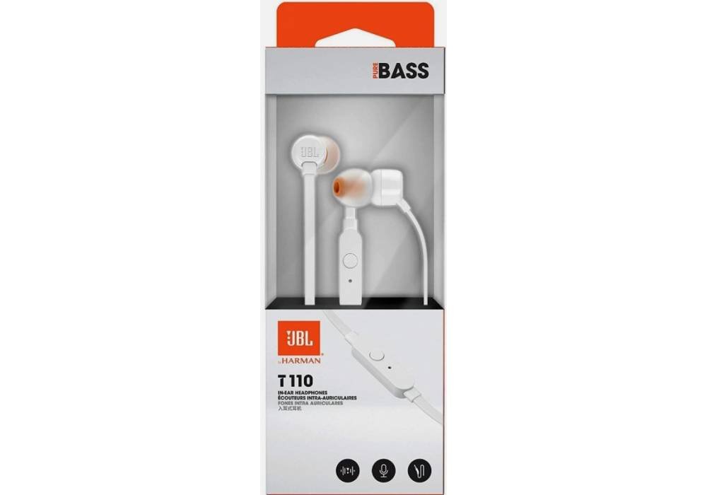 About JBLFor more than 60 years, the JBL brand has delivered products that exemplify the technology and expertise gained through our leadership in professional sound reproduction. We’ve taken this expertise and applied it to exciting audio products for your home, car, portable media player, boat, computer and gaming systems. Whatever and wherever, the JBL brand is the one that audio consumers trust because it’s the brand audio professionals rely on.JBL T110Lightweight, In-Ear HeadphonesIntroducing JBL TUNE110 in-ear headphones. They’re lightweight, comfortable and compact. Under the durable earpiece housing, a pair of 9mm drivers punch out some serious bass, reproducing the JBL Pure Bass sound. In addition, the single-button remote on a tangle-free flat cable lets you control music playback, as well as answer calls on the fly with a built-in microphone. Making the JBL TUNE110 your everyday companion for work, at home and on the road.JBL Pure Bass sound1-button remote with microphoneTangle-free flat cablePlug: 3.5mmDynamic Driver: 9mmFrequency response: 20Hz – 20kHzBass that rocks, and ready to roll.FeaturesJBL Pure Bass SoundFor over 60 years, JBL has engineered the precise, impressive sound found in big venues around the world. These headphones reproduce that same JBL sound, punching out bass that’s both deep and powerful.1-Button Remote with MicrophoneControl music playback with a convenient one-button remote. Got an incoming call? Answer it on the fly with the built-in microphone.Tangle-free Flat CableA flat cable that’s durable and won’t tangle up in knotsLightweight DesignA design that is lightweight and comfortable no matter when and where you wear them