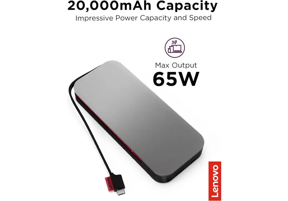 About this itemHigh-Capacity & Fast Charging: Experience the power of a 20,000 mAh capacity and blazing-fast 65W charging with Battery Model #PBLG2W. Get more power in less time.Integrated USB-C Cable: Say goodbye to tangled cords and lost cables. The Lenovo logo conceals a fixed USB-C cable that’s easily accessible when needed, ensuring hassle-free charging on the go.Quick Recharge: In just 3 hours, your power bank charges to full capacity, providing enough juice to charge your laptop at least once and your mobile devices multiple times. Stay powered up with minimal downtime.Dual USB-C Ports: Enjoy the convenience of dual USB-C capabilities, allowing you to charge up to 2 devices simultaneously while also recharging the power bank itself. Stay connected and productive without missing a beat.Triple Device Charging: With dual USB-C ports and one USB-A port, this 20,000 mAh power bank enables you to charge up to 3 devices at once. Stay versatile and keep all your devices powered up wherever you are.Power Your Productivity On The GoThe Lenovo Go USB-C Laptop Power Bank (20000 mAh) is a game-changing solution for remote workers who need access to a large reserve of power for their USB-C laptops and devices to achieve peak productivity. With a whopping 20,000 mAh capacity, you can rapidly charge multiple devices even while you are recharging the power bank.Power That Never QuitsWith 20,000 mAh and 65W at your disposal, you’ll never have to worry about running out of battery again. 3 hours is all it takes to charge the power bank to full battery. Once ready, you’ll have enough juice to charge your laptop at least once and your mobile devices several times.Simultaneous ChargingThe innovative design of the Lenovo Go USB-C Laptop Power Bank enables you to simultaneously charge up to 3 devices via dual USB-C ports and one USB-A port. Thanks to the device’s dual USB-C capabilities, you can also charge up to 2 devices while recharging the power bank itself.Hassle-free ExperienceSay goodbye to the days of carrying a bundle of cables or forgetting to bring them at all. The Lenovo Go USB-C Laptop Power Bank integrated cable is fixed to the device and easily accessible by pulling the Lenovo logo, delivering maximum performance, safety, and mobility when you need it.