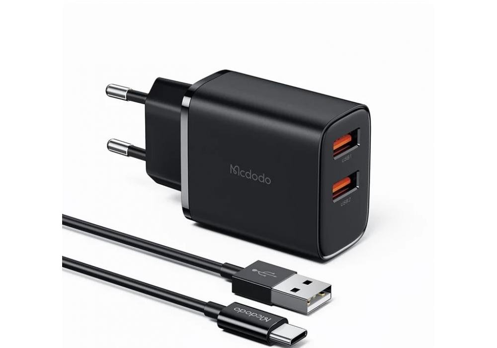 MCDODO Beryllium CH-5072 12W Wall Charger Kit with Type-C Cable 2 USB-A 2.4A Travel Charger Block, EU Plug (Black)