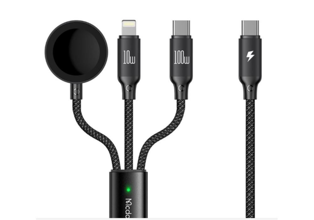 MCDODO CA-4940 Series for iPhone 15 Series 1.2m USB-C to Type-C + iP + Wireless Charger for Apple Watch 3 in 1 Charging Cable, Black