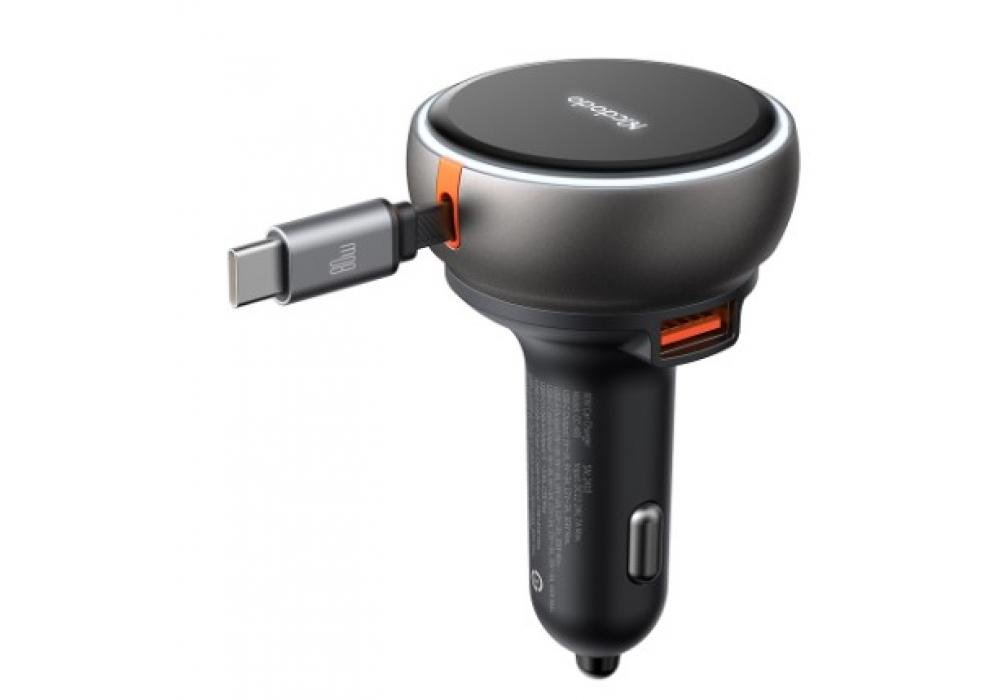 MCDODO CC4850 80W CAR CHARGER BUILT-IN 80CM RETRACTABLE CABLE80W Max OutputInterface: USB-A + Type-CBuilt-In 45W Type-C Retractable CableLength: 80cm Retractable CableIndicator Light RingPremium Zinc AlloyClutter Free & CompactOther Tangles & Mess12V-24V Universal For All Cars