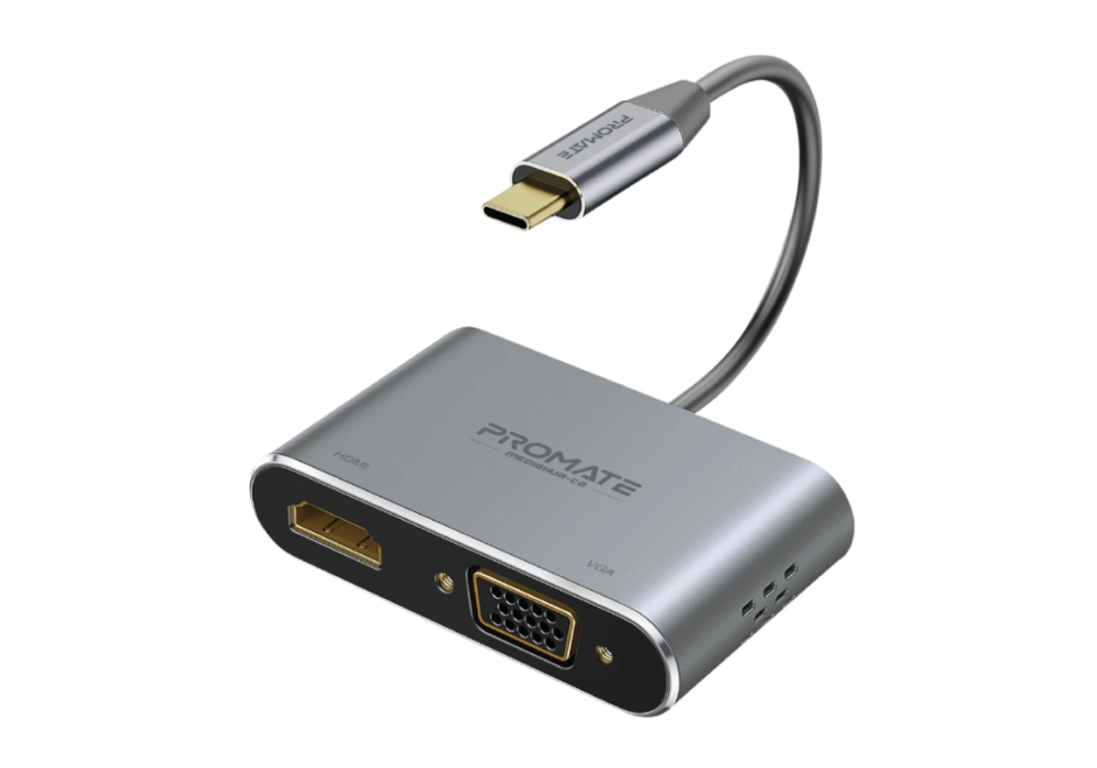 DESCRIPTIONDesigned for the ultimate viewing experience, MediaHub-C2 is a USB-C to HDMI and VGA adapter. The adapter lets you connect USB-C devices to other VGA and HDMI compatible display. The HDMI port delivers a crisp, detailed picture and audio perfect for watching videos and playing games at 4K @ 30Hz. MediaHub-C2 also sports a VGA port so that you can enjoy 1080p media at a 60Hz refresh rate without interruption. The USB-C adapter is a must if you want to enjoy an uninterrupted, stable, and high-definition viewing experience. The USB-C hub is compatible with all USB-C supporting PCs, smartphones, and tablets.FEATURESSmart 2-in-1 USB-C Adapter:Promate USB-C to HDMI VGA Adapter with HDMI and VGA port. HDMI resolution is up to 3840×2160@30Hz and VGA resolution is up to 1920×1080, 60Hz.HDMI & VGA outputs can connect and mirroring to two external displays at the same time. Allows you to enjoy HD 4K movies while working with your laptop. But when the two output ports work at the same time, the maximum resolution of the two is 1080P/60Hz.Support 4K Video Stream:USB-C port adapter HDMI offers a screen in up to 4K UHD, which is clearer than 1080P and supports simultaneously video monitor with HDMI input. With this Type C to HDMI VGA Adapter, you can enjoy vivid images, true to life at working or for home entertainment. USB-C hub VGA allows you to mirror display to your VGA-equipped TV or display in up to 1080p HD.HDMI and VGA Output Simultaneously:Video signals from a laptop with a USB Type C port can be output simultaneously to the display or the TV or the projector with HDMI or VGA input port. This HDMI-VGA converter can expand up to 2 screensNo Drivers or Power Required:Plug and play, Promate USB-C HDMI VGA converter is unnecessary to install the driver/software, it can be used easily just by inserting the cable. Multiple protections are applied for over-voltage, over-charging, over-heat. Aluminum Plate for strong antioxidant capacity. Safety wire core for high-quality insulation outer layer.Portable Aluminium Dock and Dissipate Heat:With pocket-size and Aluminum alloy lightweight design, you can put the USB-C VGA adapter into your pocket and take it to everywhere as you like and enjoy games (1080P) or 4K vivid movies in TV mode at home or use this USB-C HDMI adapter extends your laptop PPT to a 4K HD Monitor for an excellent meeting. The heat dissipation dock keeps the console cool.Extend and Mirror Mode:Supports Mirror and Extend modes, ideal for sharing information in an office or at a meeting under mirror mode; Perfectly for extending a workstation and showing a different screen on the laptop and display under extend mode; Ideal for plugging your Smartphone or Laptops to your TV and streaming a video with an extra big view.Reversible Design:The special reversible USB-C plug allows you to easily insert it without knowing which side is right in the dark.Safer Choice:Multiple protections are applied for over-voltage, over-charging, over-heat. Aluminum Plate for strong antioxidant capacity. Safety wire core for high-quality insulation outer layer.Wide Compatibility:This USB-C 2 in 1 Adapter works for MacBook, MacBook Pro, iMac / iMac Pro, DELL/XPS, HP Spectre/x360, New Chromebook Pixel, MI Air/Surface Book, Lenovo Yoga 900/910/920, Samsung S8/S9/S10/S20/Note8-Note10, Note 20, HUAWEI Mate 10, Microsoft Lumia 950XL and more.