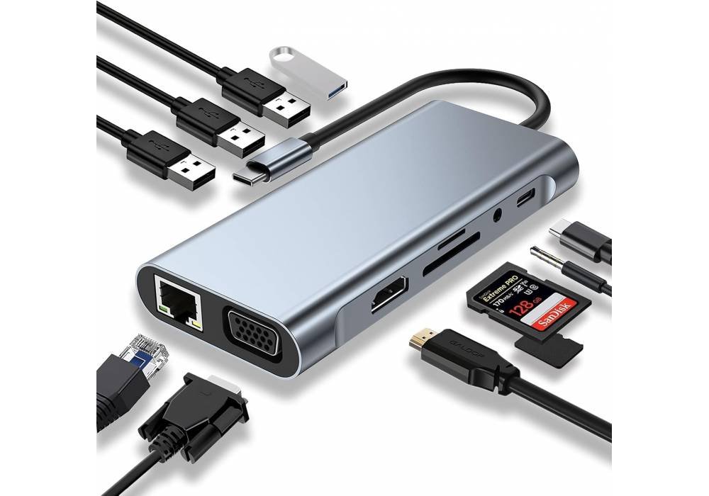 USB C HUB, USB C Adapter 11 in 1 Dongle with 4K HDMI, VGA, Type C PD, USB3.0, RJ45 Ethernet, SD/TF Card Reader, 3.5mm AUX, Docking Station Compatible with MacBook Pro/Air, Other Type C Laptops